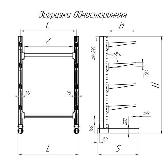 Стеллаж консольный металлический (C*S*H) 1750*1700*3000 мм имеет 3 яруса с нагрузкой до 1000 кг на 2 консоли.